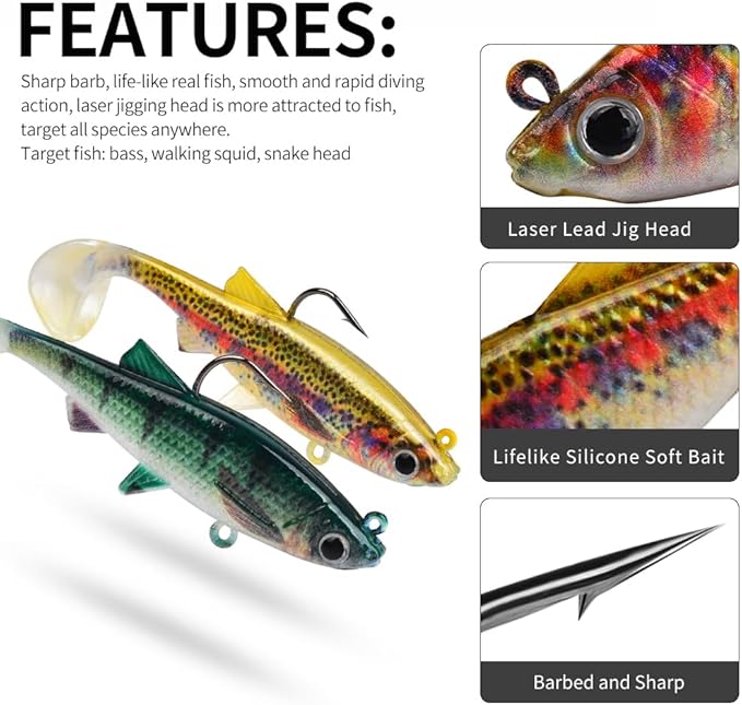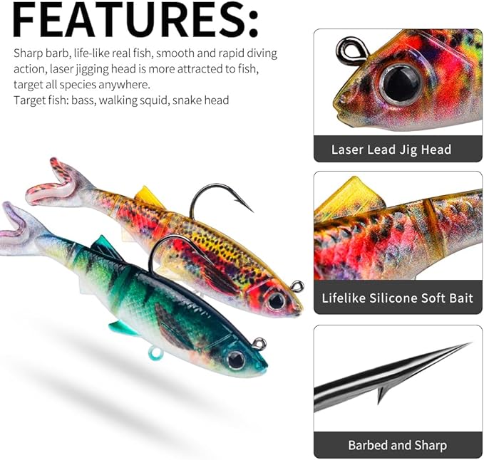 - SOFT PLASTIC SWIMBAITS - this bass fishing lures have a paddle tail offered flexible strongly swing, create natural swimming action in water. high quality materials and soft plastic body offer a life-like swimming action.