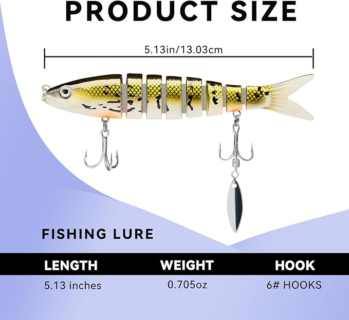 - MULIT SEGMENTS LIFELIKE LURES: 8 segments multi-jointed body, multi-layer reflective surface and 3D realistic eyes make it attracting more catches and provoking predator fish to strike