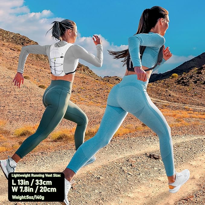 - [Breathable and Adjustable] Breathability is enhanced using lightweight mesh. Skin chafing is avoided by the race vest's soft shoulder strap edges. The chest clip can be slid up and down to a position that suits your body. Pull the waist webbing to a comfortable position and then fasten it with a black elastic tightening ring. This is suitable for both women and men runners. There's no need to worry about choosing the right size, as it's applicable to the whole family