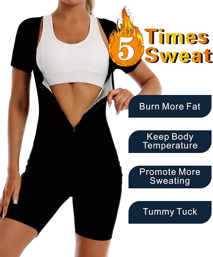 Sauna Suit 4-In-1 Waist Trainer for Women Long Torso, Lower Belly Fat Full Body Shaper Jumpsuit With Sleeve Shorts