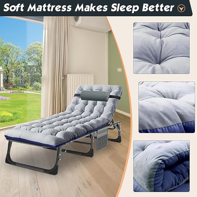- Safe and Comfortable: Our folding adjustable cot with mattress beach lounger is designed with anti-slip feet pads to ensure stability. The sunbathing chair also has a removable pillow and side pocket, which provides comfortable support for your neck and head.