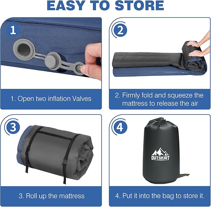 - Easy Inflation & Deflate: With the two double-way valve, this self inflating sleeping pad is super easy to inflate, just need to open the valve, and you're good to go. However, it's a little difficult to deflate and pack this camping mattress because it's bulky and weight. To solve this problem, you can reverse the valve cover and install it to the valve, prevent self-inflating when you squeeze the air out. Note: The product you received is vacuum packed, so it may take up to 5 minutes to inflate it for the first time