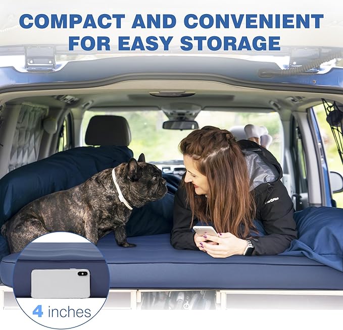 - 30% Lighter, Ultra-Portable: Our double camping sleeping pad measures 78”x52”x4” after inflation, features a revolutionary square-cut foam construction that reduces weight by 30%, only 9lbs. The sleeping mattress for camping is more lighter and portable than traditional foam pads, folds effortlessly into the included carry bag, ideal for family camping, car camping, road trips, or for guests at home