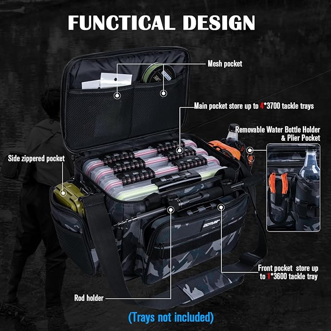 - Spacious & Organized Storage: With a large capacity, this fishing tackle bag fits 4 3700-size and 2 3600-size tackle box trays (not included, but available separately from Goture). The main compartment(14.76”x9.45”x8.66”) holds 4 3700-size tackle boxes horizontally or vertically. And the top zipper pocket and front pocket can both hold 1 3600-size tray, increasing bait capacity. Additionally, 6 external storage pockets provide quick access to your fishing tools and accessories