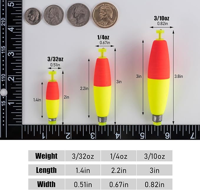 - WEIGHTED DESIGN: The weight of bobber bottom helps the float enter the water quickly and long-distance casting. The weighted float stands upright in the water surface, making it easier to be seen