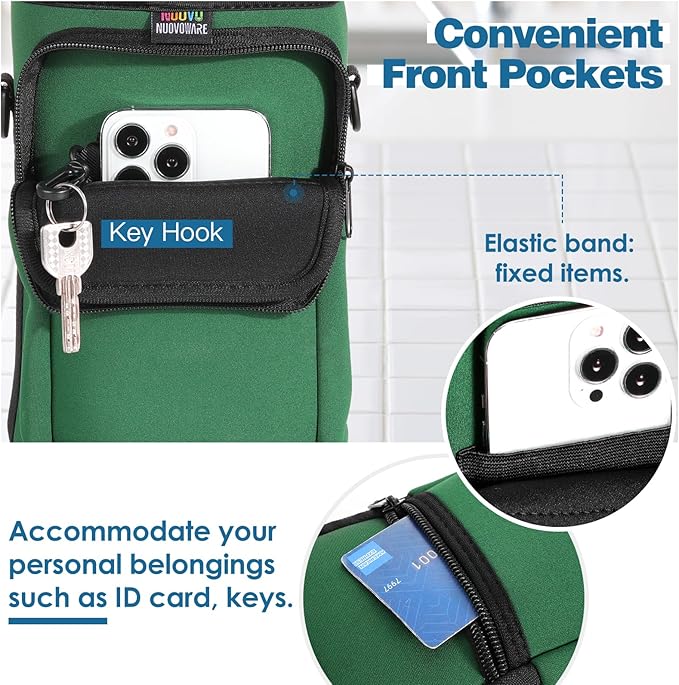 - 2 POCKETS: The small zipper pocket is for cash and card, the large zipper pocket is for smartphone, keys, and other essentials. When you go out, you just need to bring this water bottle bag, no need to carry the bag to hold these small items.
