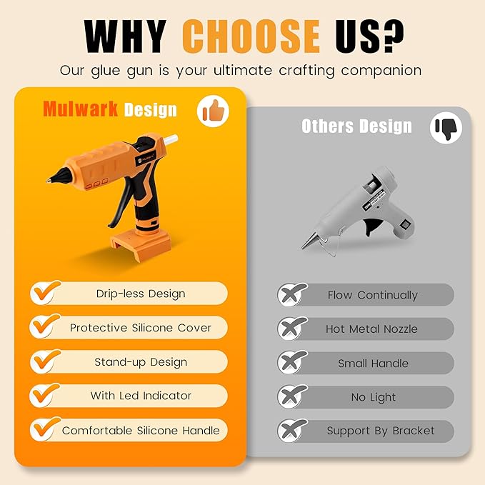 Mulwark Cordless Hot Glue Gun 100W for Milwaukee 18V Battery Handheld Wireless Power Glue Gun Full Size with 30pcs Glue Sticks for Wood, Glass, Home Repair, Arts & Crafts & DIY (battery not included)