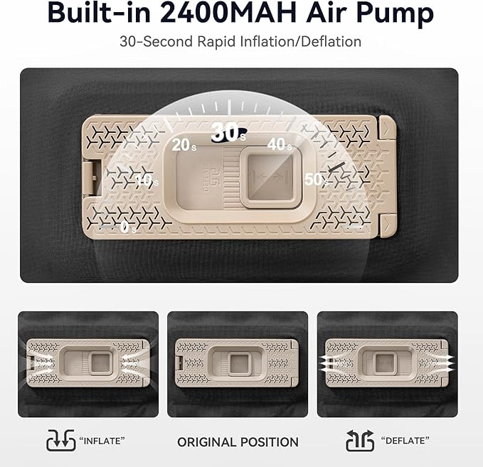 - 【Quickly Inflation & Delflation】This sleeping pad features a built-in air pump design for quick inflation and deflation. Simply slide the button to quickly inflate within 1-2 minutes, completely freeing your hands. Deflation can also be completed within three minutes, providing you with an unparalleled relaxation experience. You can adjust the softness of the camping mat by controlling the inflation time.