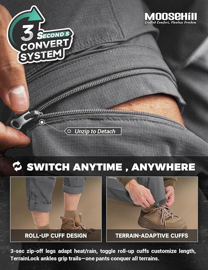 • Instant Convertible Convenience: Switch from pants to shorts in seconds! L/R zipper labels eliminate guesswork, while snag-free zippers ensure smooth transitions—ideal for sudden weather changes or trailside breaks.