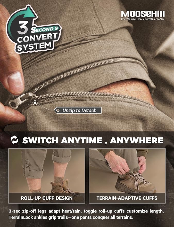 Moosehill Men's-Hiking-Pants Convertible Quick-Dry Water-Resistant Lightweight Zip-Off Outdoor with 5 Deep Pockets