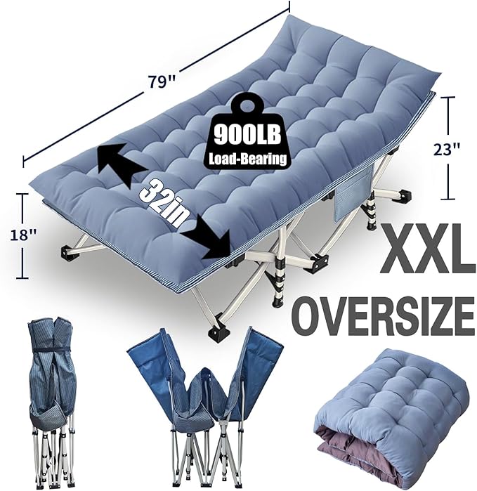 - Oversized Design: Measuring 79" x 32" x 18", this XXL camping cot provides ample sleeping space for a comfortable night's rest.