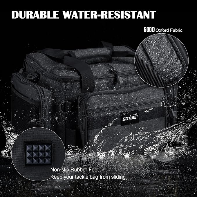 - Sturdy and Water-Resistant: Crafted from 600D water-resistant Oxford fabric, this fishing bag is built to withstand the toughest outdoor conditions. The interior is lined with pearl cotton padding, providing superior shock absorption to protect your fishing gear. The anti-slip rubber foot pads ensure stability, keeping your gear safe and secure