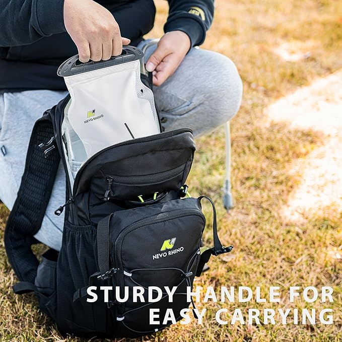 - Durable Hydration Bladder:The N NEVO RHINO Hydration Bladder is crafted with high-quality materials,package includes 2L hydration bladder,water bladder cleaning kit,2 pieces tube fixed clips,1 pieces hanging clips.Ensuring a leak-proof performance that makes it perfect for all outdoor adventures,including hiking,camping,and cycling