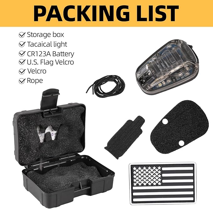 - Package List: 1* IR Helmet Light, 1* Instruction Manual, 1*CR123A Battery, 1*U.S. Flag Velcro.