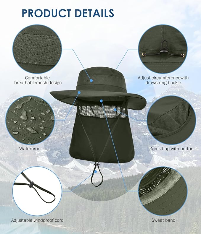 - **Versatile Neck Flap & Adjustable Fit** Enjoy adaptable sun protection with a removable neck flap that can be tucked into the hat when not needed. The adjustable drawstring and buckle at the back ensure a snug, customizable fit (22.5”-24” head circumference), suitable for men, women, and all outdoor enthusiasts.