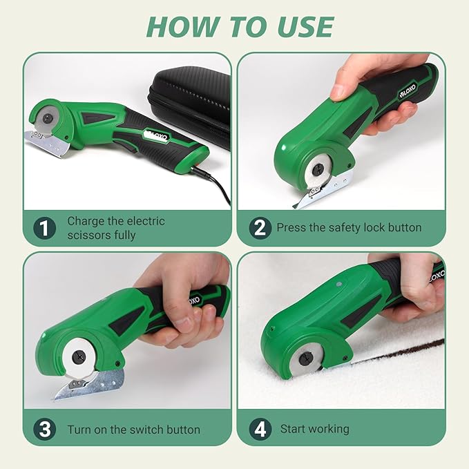 - Release the Helper of Hand: Do you feel sore wrists when using scissors? Do you feel powerless when cutting thick fabric? VLOXO electric scissors help you solve all these problems. You can easily cut the material you want while still protecting your wrist from injury. It has a 240RPM cutting speed and a 1/4” cutting capacity. The biggest use is to improve your cutting efficiency.