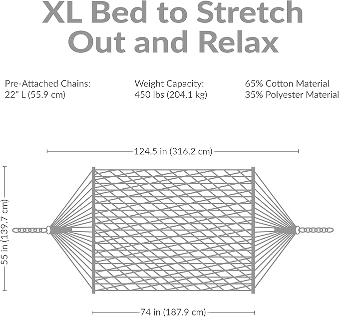 - COMFORTABLY FITS TWO PEOPLE: This large hammock measures 124.5" L x 55" W. This bed size is 74" L x 55" W. The pre-attached hanging chains are 12.75" L. It has a heavy-duty weight capacity of 450 lbs.