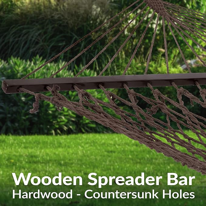 - CLASSIC AND DURABLE: This double hammock with spreader bar is made from a soft 65% cotton and 35% polyester rope material and features classic hardwood spreader bars for added style, comfort, and relaxation.