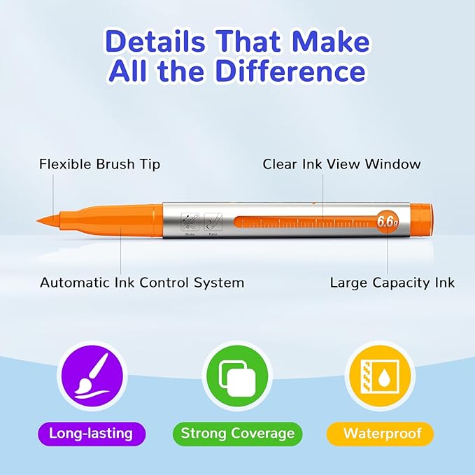 - 【Automatic Ink Control System and Visible Indicator】 This acrylic paint set has innovative automatic ink control System for even ink flow, perfect for details and broad strokes. Never need to guess how much ink is left again! Our brush tip acrylic paint markers' transparent ink window gives you a clear, real-time view of the remaining ink. This smart design for ensureing you always know when it's time to reorder, so you can stay focused on your masterpiece without interruptions