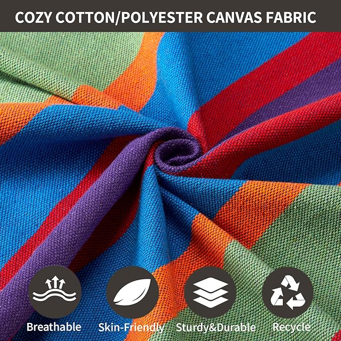 - Durable Hammock with 450LBS Weight Capacity,the cotton/polyester blended fabric is breathable and durable, with thick ropes and tight hand-weaven loops, Also,we prodvide two 2.5cm wide tree straps with high-strength polyester material and two 8cm carabiners,our hammocks are tested to hold 450lbs weight safely.