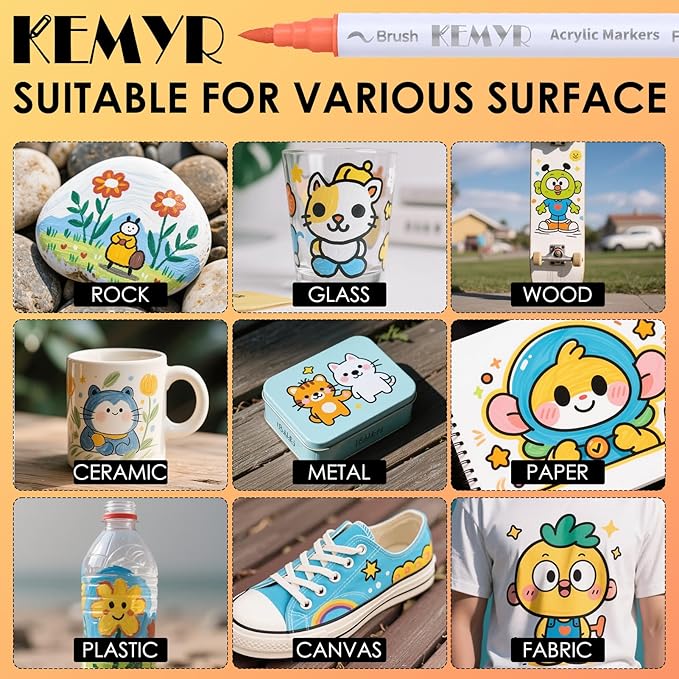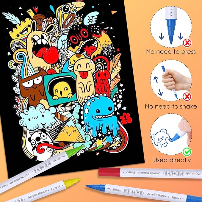 - Dual Tip Acrylic Paint Pens----Each KEMYR pen is equipped with a 1 mm fine tip for lines and details work, and a 1 - 5 mm brush tip for filling large areas and coloring. By changing the brush pressure, you can create different strokes, saving the trouble of changing tips.