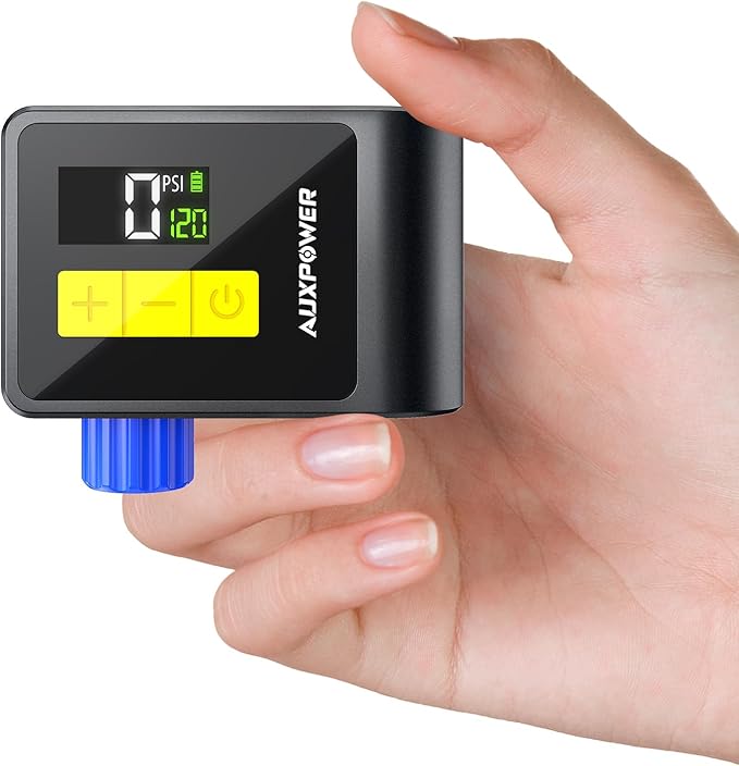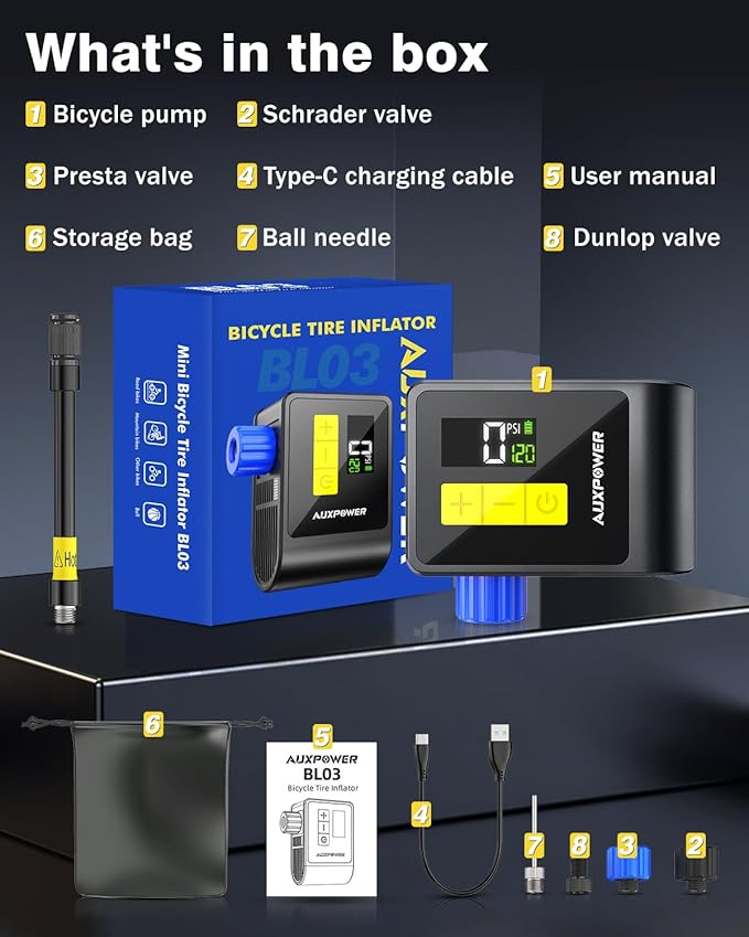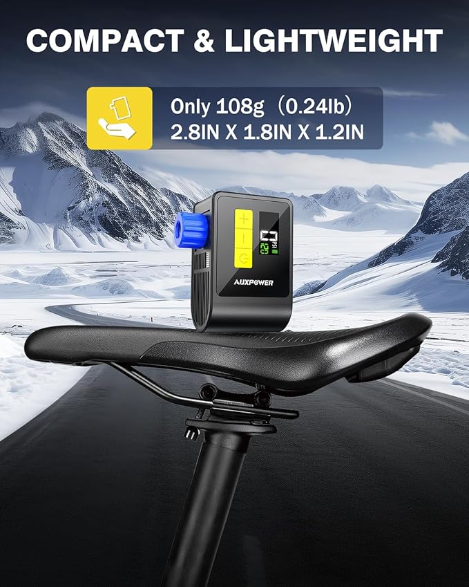- 【Powerful and Fast】 Auxpower bike pump is driven by a brushless motor to maximize pumping efficiency and longevity, this tiny bike pump can inflate a 700X23 C road bike tire from 0-80PSI in 40s, inflate a 700X23C tire from 0-120PSI in 80s, ensuring safety, comfort, and efficiency all the way through your cycling journey.