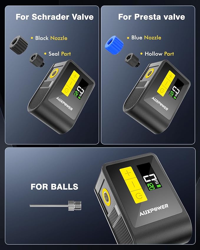 - 【Compatible with Dual Valve】It features both Presta and Schrader valve compatibility(blue is Presta valve, black is Schrader valve), making it versatile for different types of bikes. Whether you are on a road trip, mountain riding, or just enjoying the outdoors, this electric bike pump a reliable choice.