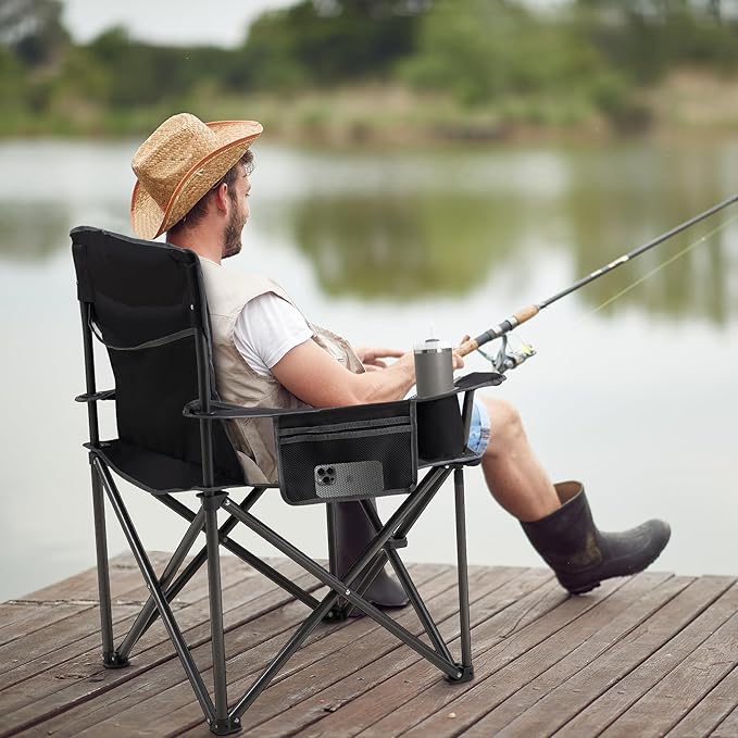 Oversized Folding Camping Chair for Adults - 450lbs Support - Heavy Duty Portable Lawn Chairs with Side Pocket Cup Holder Cooler Bag for Sports Garden Beach Fishing, Black