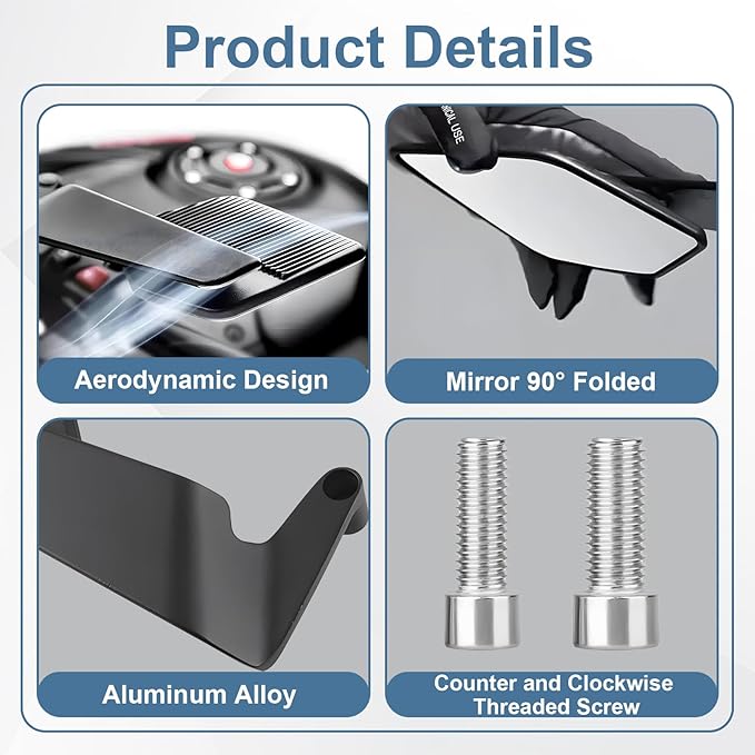 - 【Aerodynamic design】It's a wing when closed, and a rearview mirror when open. The aerodynamic rearview mirror enhances the appearance of the horizontal design, and its wing Angle of 25° relative to the ground gives it a linear appearance, ensuring that it generates downforce, which improves the grip and handling of the motorcycle, especially at high speeds.