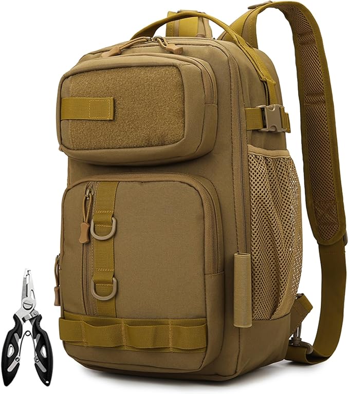 Fishing Backpack - Tackle Sling Bag- Fishing Gear Bags with Rod Holder and Fish Plier (Tan)