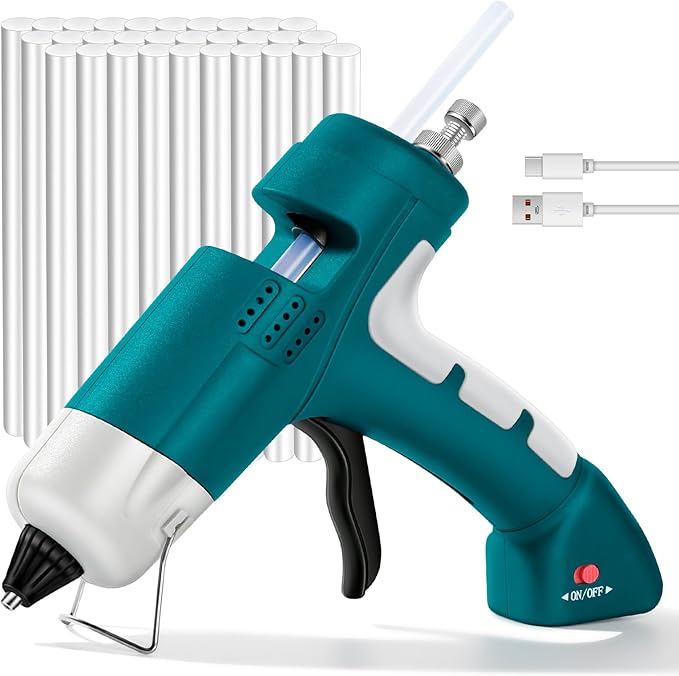 - 【Cordless Hot Glue Gun Kit】This cordless glue gun kit include: 1*Cordless glue gun,30pcs*Premium glue sticks(7mm*150mm),1*Type-C charging cable,1*English manual.Simple Operation.The hot glue gun is suitable for kids and adult, glue sticks are compatible with most materials, you can glue anything you want.