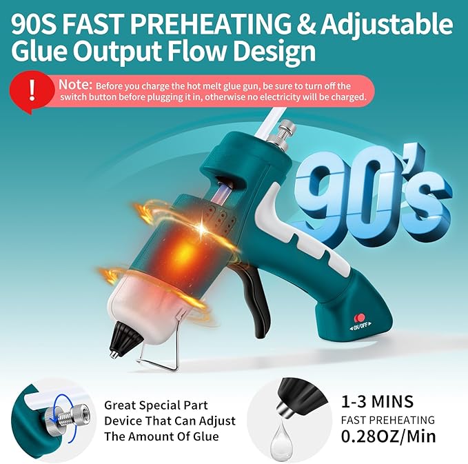 - 【Fast Preheating & Precision Control】Hot glue gun cordless gets to work faster with a quick 1-3 minutes heat-up time(pistola de silicona caliente). The button at the back of the glue gun can precisely control the amount of glue.The nozzle, with its clever design featuring a rubber protector, can prevent scalding and glue leakage, ensuring maximum safety.