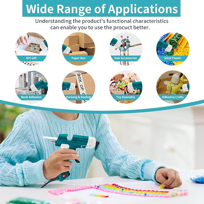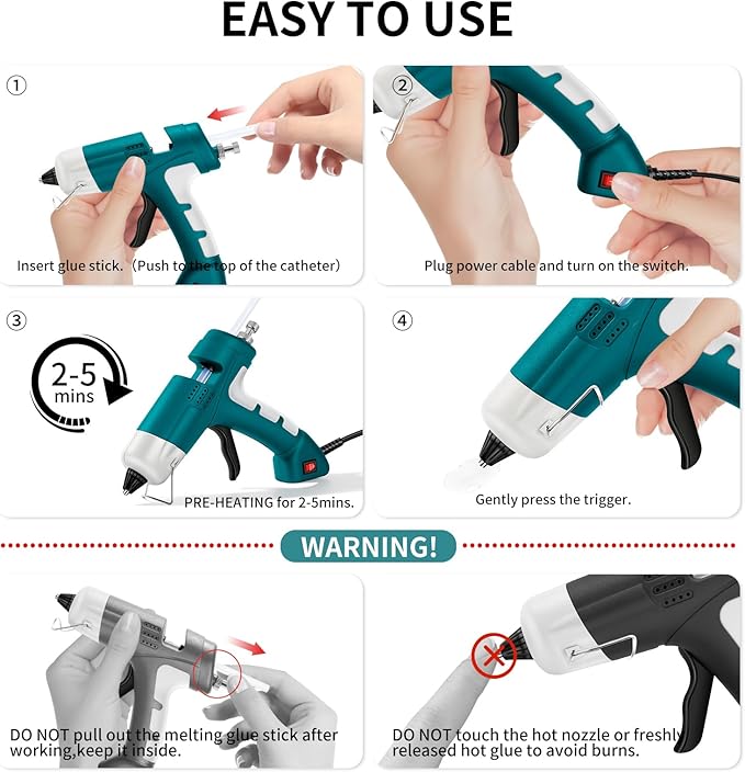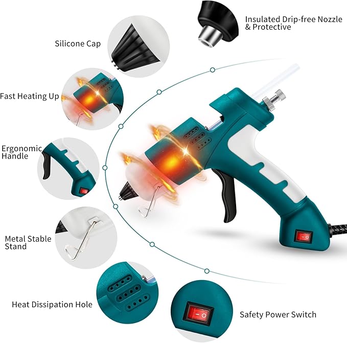 - 【High-quality Safety Material】Hot glue gun is crafted from highly heat-resistant PBT engineering plastic and featuring a thermal insulated cap with heat-resistant rubber, this glue gun prevents burns and ensures safe handling.Simple operation, safety fuse offers overheating protection. Gule gun comes with premium 30pcs non-toxic, strong adhesive 7mm-diameter 5.91-inch long high purity glue sticks that dry quickly and work on a wide range of materials.