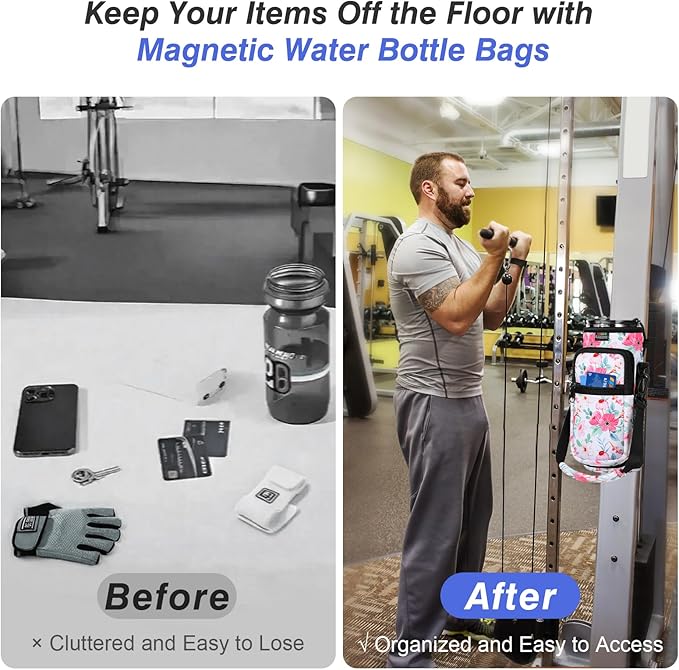 - Powerful Magnetic Fixture: Our magnetic gym bag is built-in with three powerful magnets, which can be securely attached to the surface of any metal fitness equipment, allowing you to access your water bottle at any time during your workout. Ensure your water bottle and personal belongings stay firmly in place and organize your items with ease.