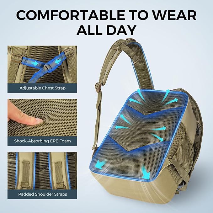 - Comfortable to Wear All Day – Built for extended fishing trips, the KastKing KarryAll KastMate Fishing Tackle Backpack delivers superior comfort and support. Shock-absorbing EPE foam cushions your back, while padded shoulder straps help distribute weight evenly and reduce fatigue throughout the day. An adjustable chest strap keeps the pack secure as you move from spot to spot.