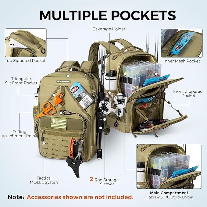 - Organize Your Gear – The KastKing KarryAll KastMate Fishing Tackle Backpack offers a smart multi-pocket layout to keep your gear organized. The spacious main compartment fits up to 4*3700-size utility boxes, while an inner mesh pocket holds soft bait bags. A top zippered pocket is ideal for your phone. Additional storage includes a large front zippered pocket, a triangular slit front pocket, 2 rod storage sleeves, a beverage holder, D-ring attachment points, and a MOLLE system.