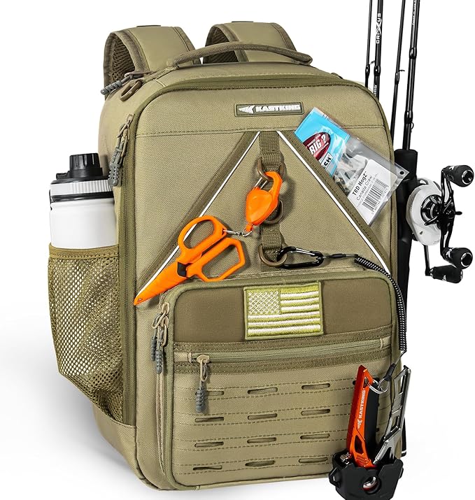 KastKing KarryAll KastMate Fishing Tackle Backpack,Water-Resistant Tackle Bag With 2 Rod Holders,Fishing Gear and Equipment With Large Gear Storage,Khaki