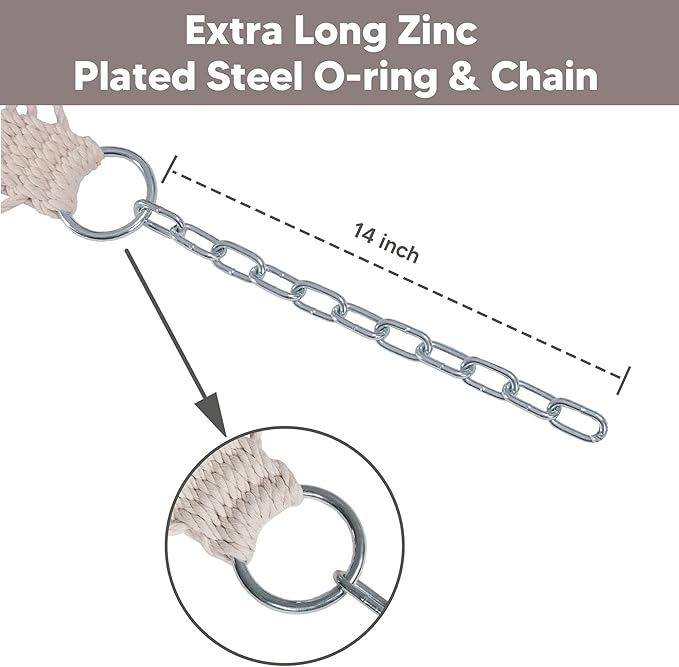 - Handcrafted Ropes: The heavy duty ropes are hand-woven with comfortable, long-lasting thread twists done by hammock artisans. 18 strong ropes are connected together and woven into a beautiful triangle pattern, which attaches to O-shaped steel ring