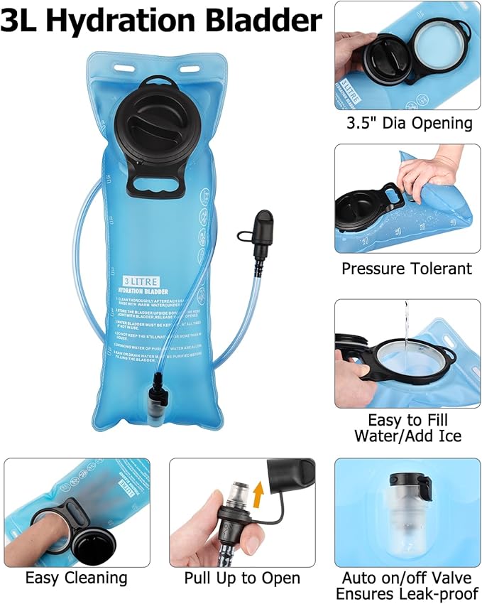 - Professional Leakproof 3L TPU Water Bladder - Our hiking water backpack packs with a 3L large capacity TPU hydration bladder, which is no BPA and odor, and has a 3.5” large open mouth, which is easy to clean and add ice cubes. And 3L large capacity ensures enough water supply for a long day’s exhausted hiking, trekking, biking.