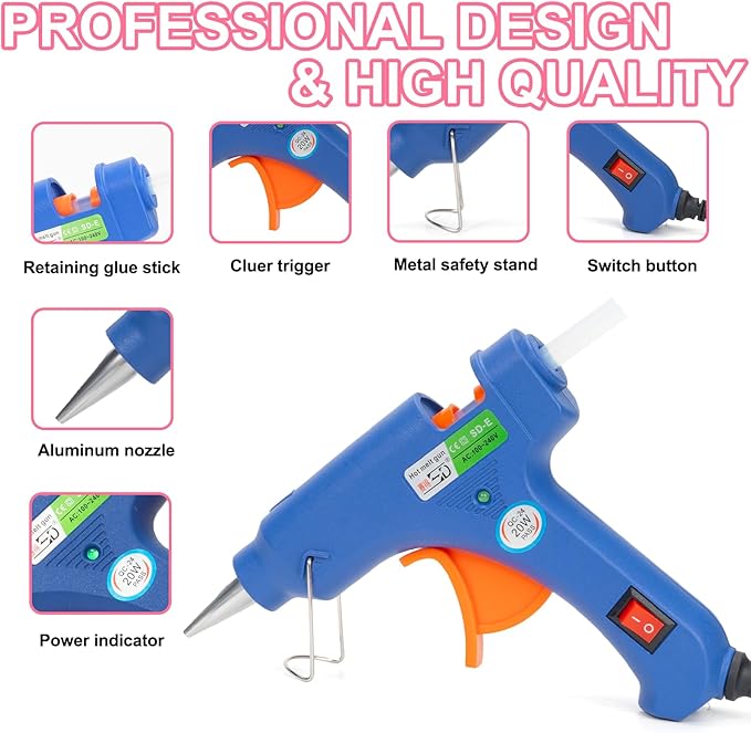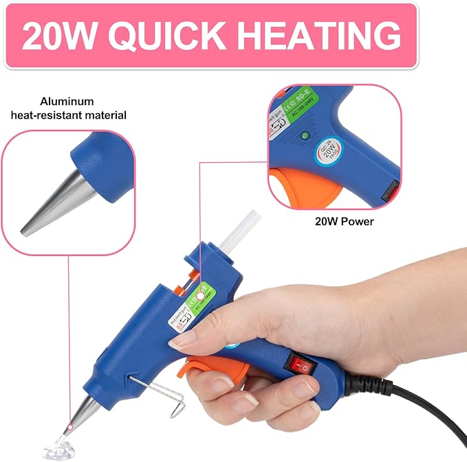 - 20W QUICK HEATING: Our 20W mini hot glue gun heats up in 3-5 minutes and the built-in constant temperature module keeps your mini hot melt glue Gun at a constant temperature to prevent the glue sticks from dripping during using.Ideal for home, office and school use, DIY crafts projects with metal, wood, glass, card, fabric, plastic, ceramics and so on.