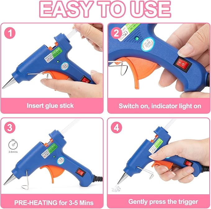 - SAFETY DESIGN & EASY TO USE: The built-in fuse prevents it from overheating, Solid durable, shock-proof and heat-proof plastic outer body.The nozzle is wrapped in rubber that will protect it from scalds.It’s easy to toggle the On/Off switch so that you don't need to unplug them every time you want to turn them off, and the LED indicator light lets you know that the tool is heating up. Simply pull the trigger gently, the melted glue will gently exude.Its ergonomic design makes it comfortable to hold and easy to use, suitable for both beginners and experienced crafters.