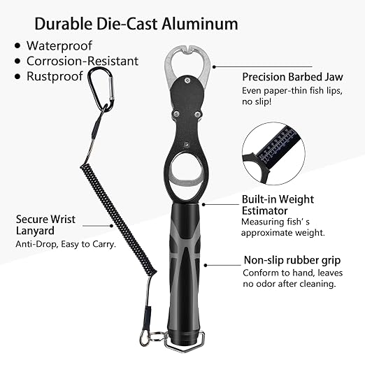 - Durable Die-Cast Aluminum Construction – Built to last, our fish gripper is made with high-strength die-cast aluminum, offering excellent water resistance, corrosion protection, and rustproof performance for all-weather fishing.