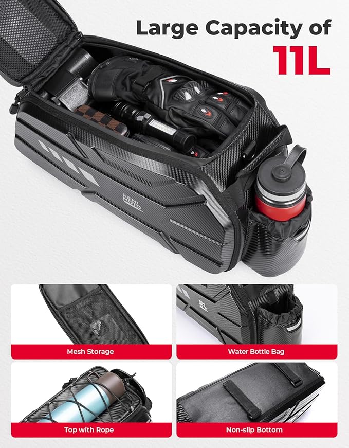 - Upgraded Version with PP Broad: The bike bag is equipped with a PP partition inside, which makes the bag more stable during rides and less prone to shaking. Designed for both daily commutes and epic long-distance rides, this 11L capacity bike trunk bag offers enough space to keep all your essentials organized