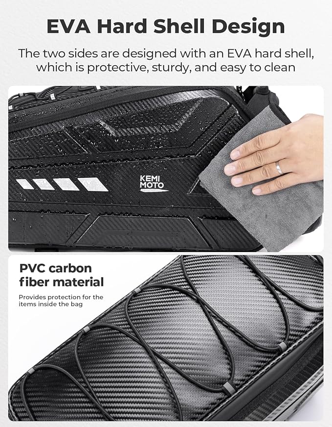 - EVA Hard Shell for more Sturdy: The rear bike rack bag is made from 85% PVC and 15% EVA hard shell. Its solid form maintains its shape, adding a dash of style to your ride. Plus, you won't need to fret about rainy days, a rain cover is included for extra protection