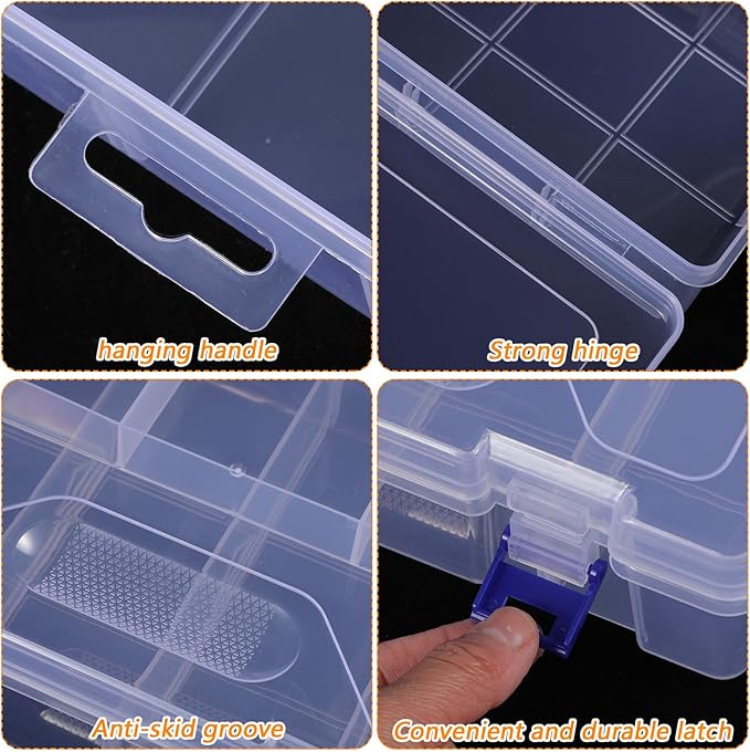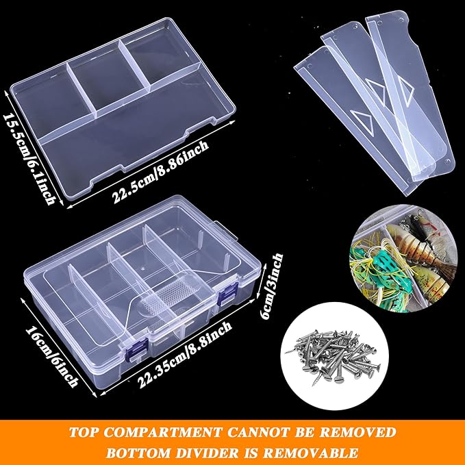 - Fishing Storage Container: the tackle box's sturdy latch closes securely, without getting mixed up or scattering; Self contained non slip grooves for easy portability, the removable top tray has 4 compartments that are not removable, and the bottom base storage has 3 removable and adjustable dividers that can be divided into 4 compartments, designed with side hanging holes for hanging on the wall, saving your space