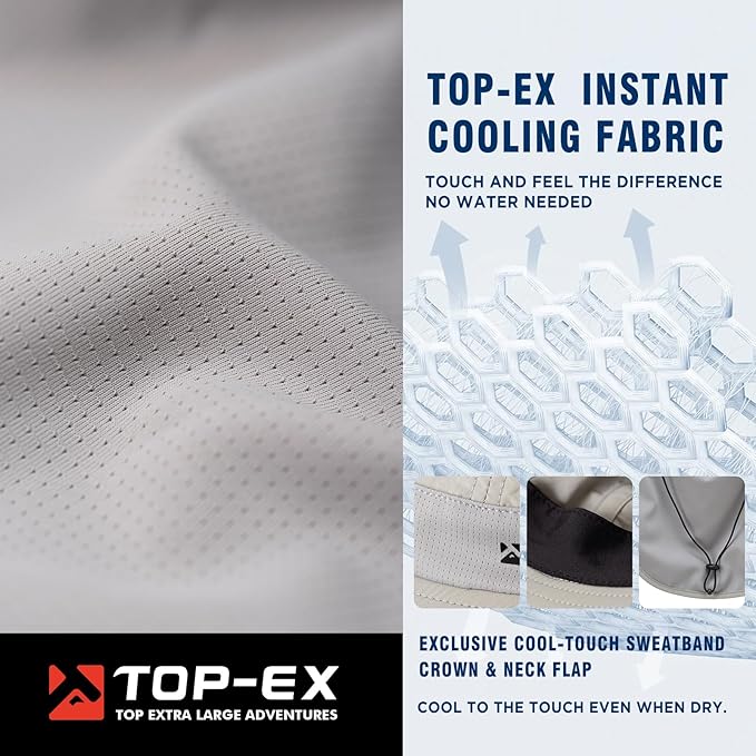 - 【TOP-EX Instant Cooling Tech – No Water Needed】 Engineered for high-heat performance, this hat uses exclusive contact-cooling fabric in the sweatband, crown, and inner neck flap to deliver instant coolness—no water needed. The wide brim and full neck flap provide sun coverage while the breathable, sweat-wicking build keeps you dry. Ideal for hiking, fishing, beach walks, and long days outdoors.