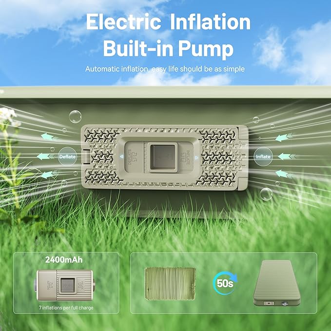 - Rechargeable and Removable Smart Charging Pump - Our portable pump features a robust 2400mAh battery capacity, delivering rapid inflation for camping mats within 50 seconds. After a full charge (3-4 hours), it supports up to 7 automatic inflation cycles. This design allows you to spend less time setting up gear and more time embracing nature's serenity