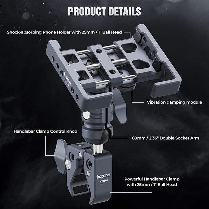Shock-Absorbing Phone Clip Kit, Aluminum Double Socket Arm and Handlebar Strong Rod Clamp, Installed on 0.55-1.77" Diameter Rail Round Rod (KPS-13)