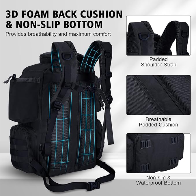- Water-Resistant and Sturdy: Our fishing backpack is constructed with 900D waterproof Oxford fabric, ensuring long-lasting wear resistance and scratch protection. The tackle backpack includes a rain cover to ensure your belongings stay fully dry. The rubber non-slip foot pads on the bottom grip any surface to keep your bag in place. A reflective stripe in front enhances visibility and safety at night