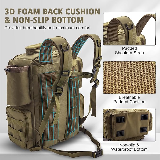 - Water-Resistant and Sturdy: Our fishing backpack is constructed with 600D waterproof Oxford fabric, ensuring long-lasting wear resistance and scratch protection. The tackle backpack includes a rain cover to ensure your belongings stay fully dry. The rubber non-slip foot pads on the bottom grip any surface to keep your bag in place. A reflective stripe in front enhances visibility and safety at night